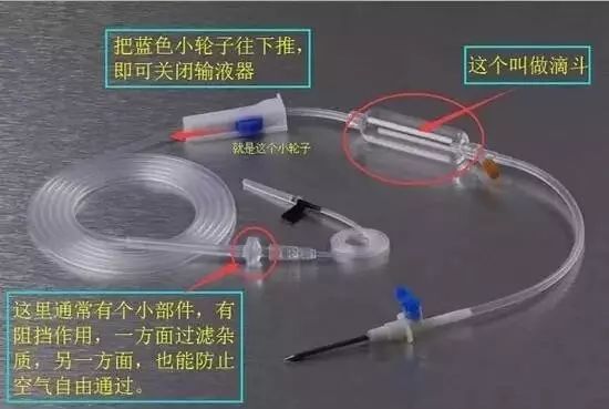 再者,在輸液管小滑輪調(diào)節(jié)器的下方,輸液管連接針頭的位置,有一個(gè)凸起的圓形小部件--濾網(wǎng)。它可以起到阻擋的作用,一方面可以過(guò)濾藥水中可能含有的雜質(zhì),另一方面也可以防止大量空氣自由通過(guò)。所以在輸完液后,如果忘記換藥或拔針,你應(yīng)該擔(dān)心的不是空氣鉆進(jìn)到你的血管里,而是血液回流。