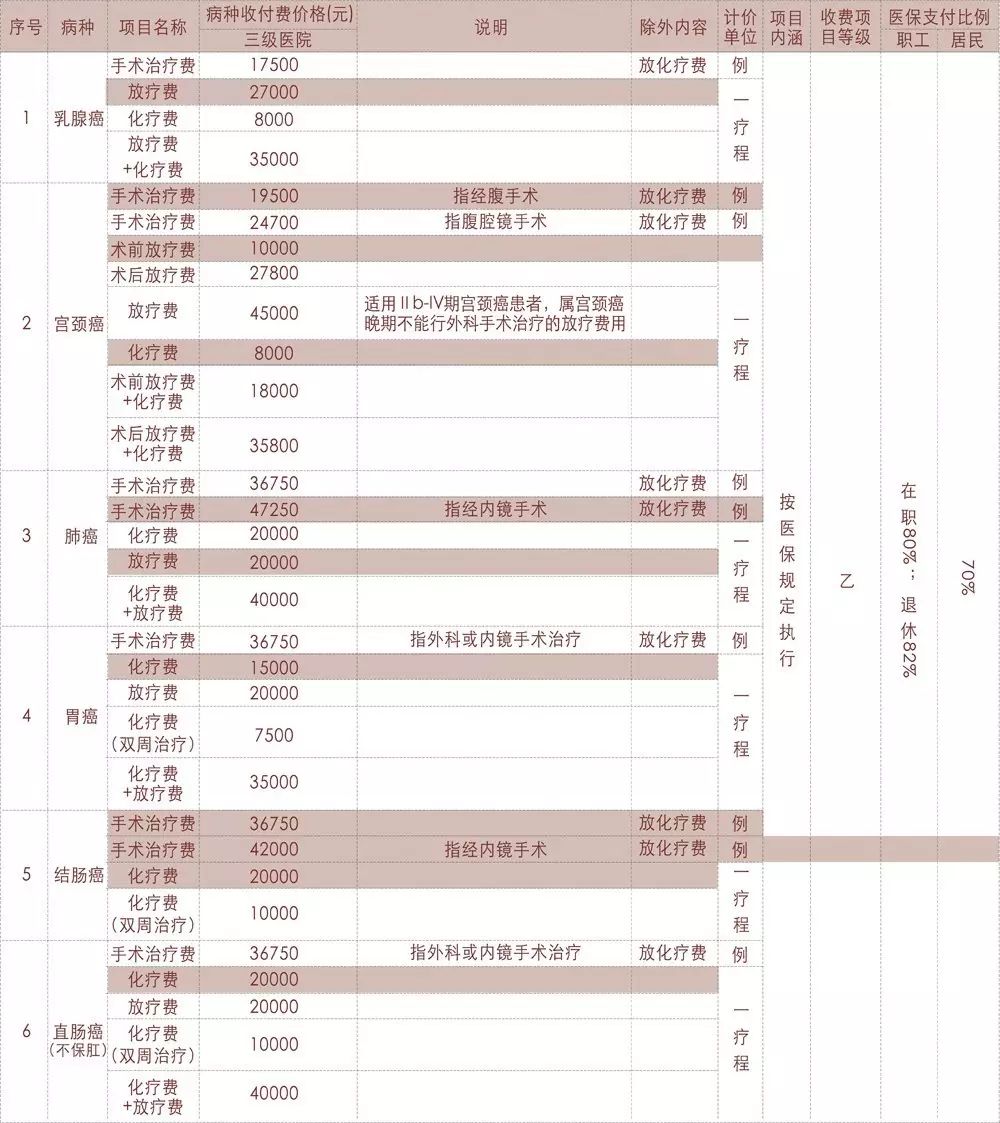 2.以上病種的手術(shù)治療、放化療及規(guī)定的病種收費(fèi)標(biāo)準(zhǔn)包含患者住院期間所發(fā)生的診斷與治療等各類費(fèi)用,即從患者入院,按病種治療管理流程接受規(guī)范化診療最終達(dá)到療效標(biāo)準(zhǔn)出院,整個(gè)過程中所發(fā)生的診斷、治療、手術(shù)、麻醉、護(hù)理、床位、藥品、放療(含定位、制模等費(fèi)用)以及醫(yī)用材料等各種費(fèi)用。