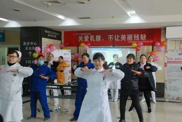 科普小組成員現(xiàn)場傳授乳房保健操,在場觀眾熱情高漲,紛紛加入了保健操的隊伍,看來大家的自我保健意識還是很強的!