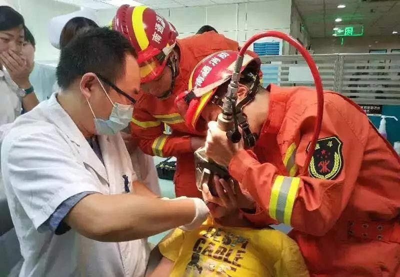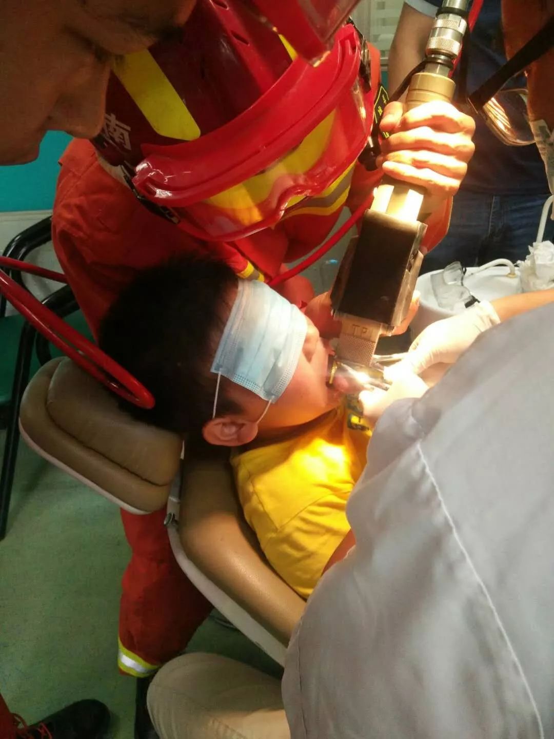消防員們隨身攜帶的液壓擴(kuò)張器可派上了大用場(chǎng),吳醫(yī)生用鉗子固定住金屬圈,消防員則用擴(kuò)張器一點(diǎn)點(diǎn)將環(huán)撐開,大家互相配合著,終于將孩子的舌頭“解救”了出來(lái)。