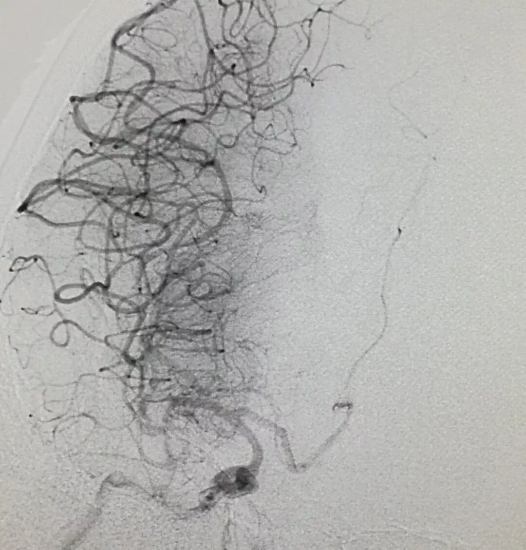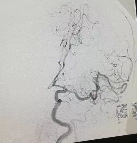 靜脈溶栓治療后,患者血管未能開通,經(jīng)與家屬溝通,張騏主任決定對(duì)患者行緊急全腦血管造影+機(jī)械取栓。神經(jīng)內(nèi)科卒中小組當(dāng)即會(huì)同神經(jīng)外科、介入科、麻醉科、影像科、導(dǎo)管室等相關(guān)科室組成的搶救團(tuán)隊(duì)共同為患者行機(jī)械取栓治療。造影顯示患者右側(cè)頸內(nèi)動(dòng)脈起始段和右側(cè)頸外動(dòng)脈起始段均閉塞,搶救團(tuán)隊(duì)密切配合,熟練的將取栓支架置入血管取出栓塞斑塊,兩次取栓先后順利完成,造影顯示動(dòng)脈已順利開通。