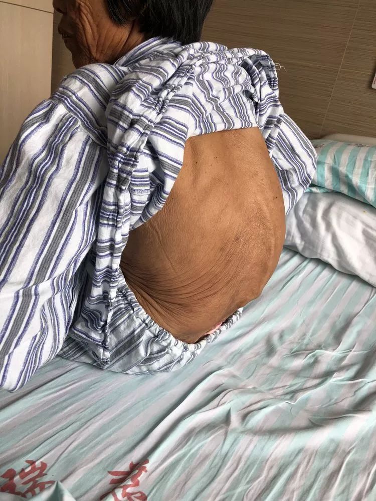 因?yàn)槎嗄甑难甸g盤突出,今年73歲的仇大媽脊柱變形,嚴(yán)重后凸側(cè)彎,駝背已經(jīng)將近90度,只能彎著腰走路,睡覺(jué)也不能平躺。而因?yàn)榧怪冃?,體內(nèi)臟器也受到不同程度擠壓,腹部空間被折疊、壓縮,深深凹進(jìn)體內(nèi)。近日,她又因?yàn)槟懡Y(jié)石引發(fā)了梗阻性黃疸和急性胰腺炎,一直腹痛、嘔吐,命懸一線。