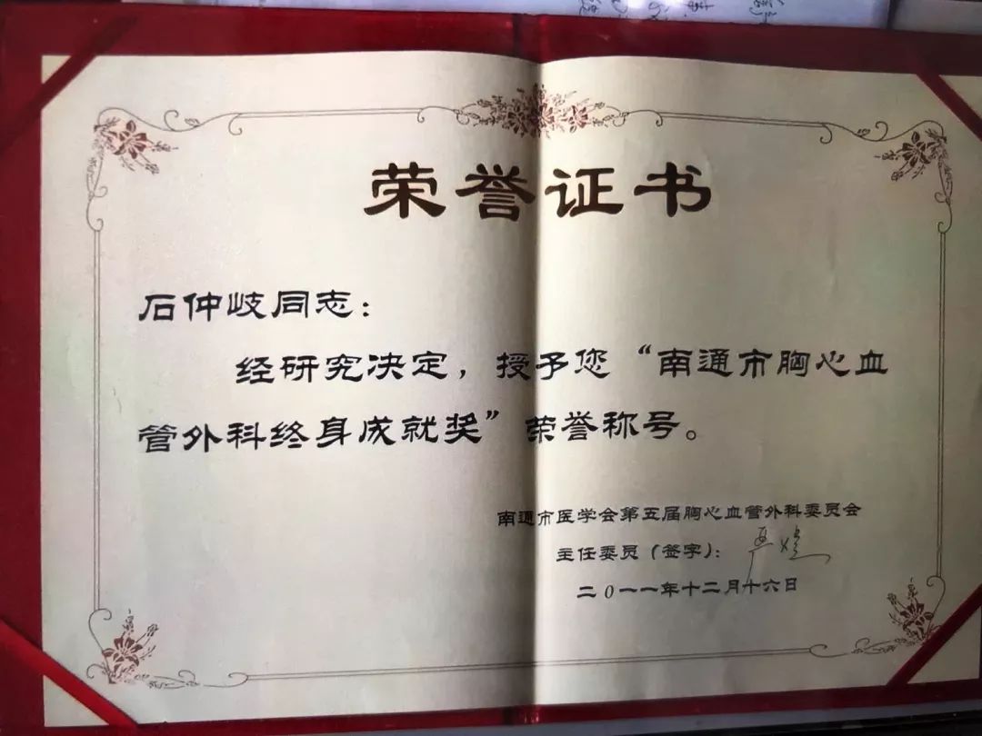 此次大會上,全省共有8位老專家獲此殊榮,石仲歧是蘇中、蘇北地區(qū)唯一入選的專家。獲獎專家的平均年齡在75歲以上,都曾擔任過本地區(qū)心血管外科分會主任委員及以上職務,熱心心血管外科事業(yè),具有優(yōu)異的學術(shù)成就和公認的學術(shù)地位,為江蘇省心血管外科學發(fā)展做出過巨大貢獻。