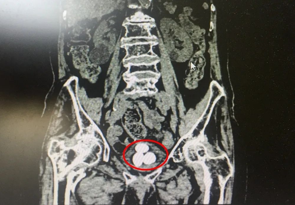 99歲的啟東老人楊奶奶,2年多前因?yàn)樗麑?dǎo)致了右側(cè)髖關(guān)節(jié)骨折,造成右腿畸形愈合,日常行走不便,長(zhǎng)期臥床。之后,老人開(kāi)始出現(xiàn)間斷血尿,到當(dāng)?shù)蒯t(yī)院檢查后發(fā)現(xiàn)患上了膀胱結(jié)石,因?yàn)闂钅棠棠挲g較大,手術(shù)風(fēng)險(xiǎn)高,醫(yī)生建議藥物治療,對(duì)癥消炎、止血。今年4月,楊奶奶再次出現(xiàn)了血尿情況,尿液深紅色,還有血塊。這一次,家人還是帶她去醫(yī)院保守治療,結(jié)果10多天了依然不見(jiàn)改善。持續(xù)的血尿,伴隨著尿頻、尿痛,讓老人的生活深受困擾。這樣的長(zhǎng)壽本是福氣,楊奶奶卻每日受著疾病煎熬,吃不下睡不著??粗赀~的母親痛苦難耐,楊奶奶的子女們也很揪心。到底還能不能做手術(shù)把結(jié)石取出來(lái)?帶著這樣的疑問(wèn),在住進(jìn)南通瑞慈醫(yī)院泌尿外科病房之前,子女們咨詢了多家醫(yī)院,卻都被婉言謝絕。▲影像資料顯示,楊奶奶的膀胱幾乎被三顆結(jié)石占滿