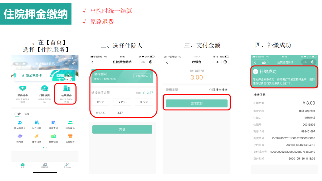 1、患者需先辦理住院手續(xù),即可在微信上添加住院人信息,繳納住院押金,并支持查看住院日清單。