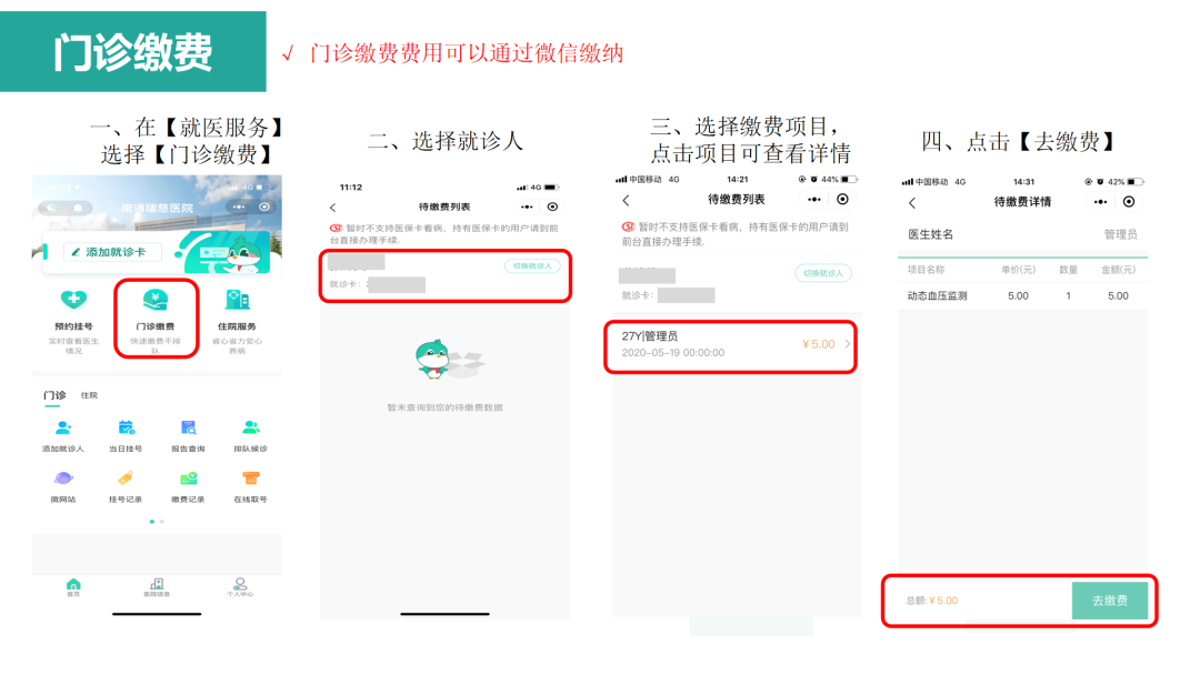 點(diǎn)擊首頁【門診繳費(fèi)】-選擇就診人-獲取待繳費(fèi)列表-支付