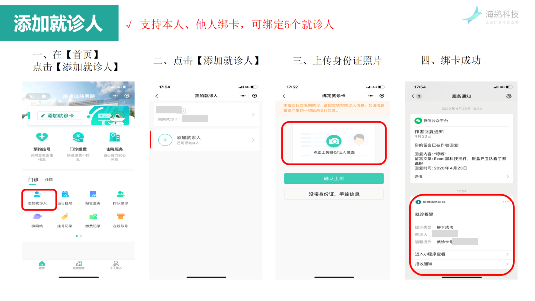 點(diǎn)擊首頁【添加就診人】-上傳身份證人像照或手動(dòng)輸入姓名、身份證號(hào)、手機(jī)號(hào)等信息-綁卡。