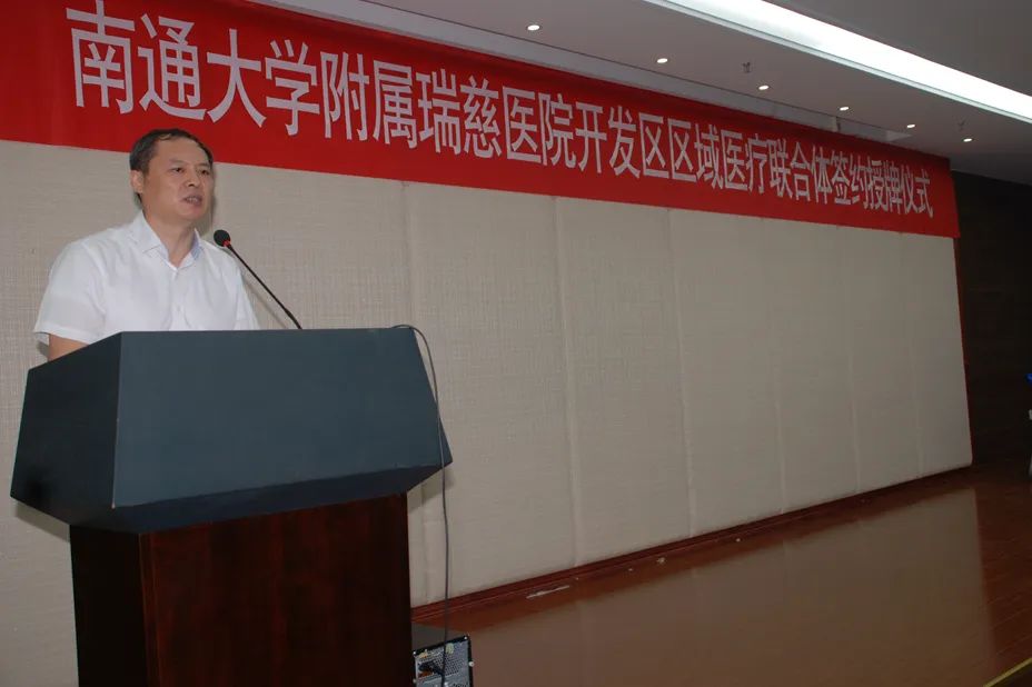 7月8日下午,南通大學(xué)附屬瑞慈醫(yī)院與開(kāi)發(fā)區(qū)4家社區(qū)衛(wèi)生服務(wù)中心組建醫(yī)療聯(lián)合體簽約授牌儀式隆重舉行。南通市開(kāi)發(fā)區(qū)管委會(huì)副主任劉鋒,社會(huì)事業(yè)局局長(zhǎng)邵平、副局長(zhǎng)黃裕若,開(kāi)發(fā)區(qū)中興、小海、新開(kāi)、竹行街道衛(wèi)生服務(wù)中心主任等領(lǐng)導(dǎo)及嘉賓出席了儀式。