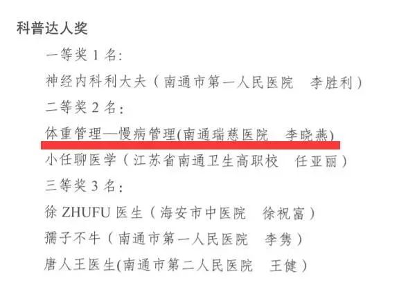 根據(jù)9月3日的評選結(jié)果通知,此次活動共收到參評作品51件,經(jīng)評選委員會嚴(yán)格評審,最終有22件作品獲獎。其中,南通大學(xué)附屬瑞慈醫(yī)院內(nèi)分泌科的參賽作品《生酮飲食靠譜嗎?》獲得優(yōu)秀作品獎二等獎;南通大學(xué)附屬瑞慈醫(yī)院內(nèi)分泌科主任李曉燕獲科普達(dá)人獎二等獎。