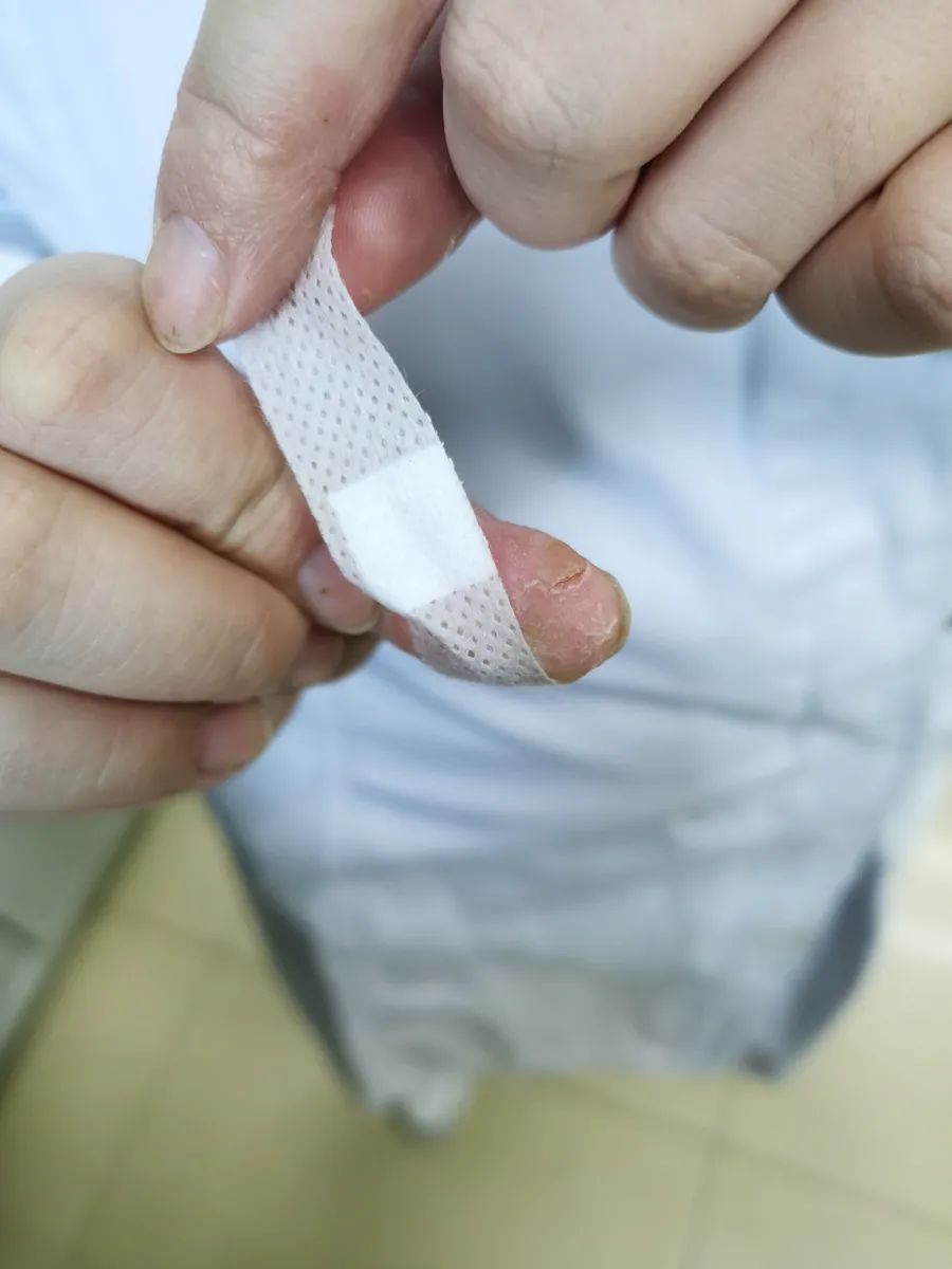 △因?yàn)轭l繁地使用洗手液、消毒液,開藥瓶配藥,急診科輸液班的當(dāng)班護(hù)士錢玲玲雙手變得粗糙,右手大拇指尖開裂。