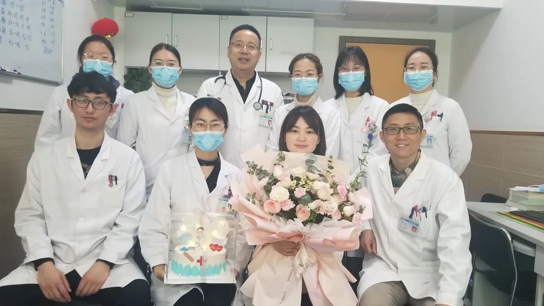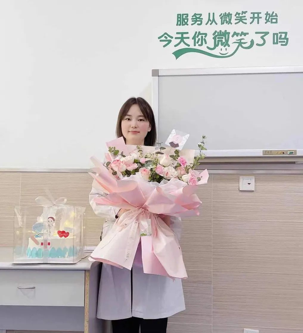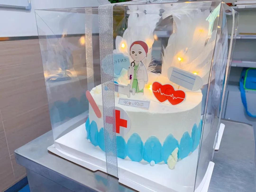 這天早晨8點多,正在二病區(qū)醫(yī)生辦公室開始一天忙碌的唐美玲醫(yī)師忽然接到了一個電話,電話那頭響起了外賣小哥的聲音:“你訂的鮮花和蛋糕到了?!被貞浧甬敃r的場景,唐醫(yī)生說自己第一反應是外賣員送錯外賣了。只見蛋糕插卡上寫著:“國際醫(yī)師節(jié)快樂!”,還有紅十字、女醫(yī)師卡通造型、愛心、注射器,以及象征“白衣天使”的白色羽毛翅膀裝飾,雖然寄送人不明,但這份精美的蛋糕依然引來了同事們的圍觀,讓所有人都感受到了送出這份禮物之人的用心。