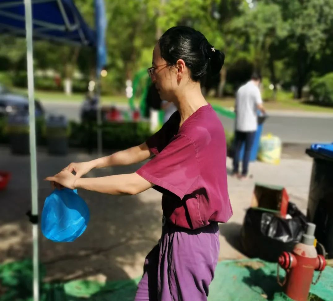 不少采集點(diǎn)都在室外,雖然有冰塊和風(fēng)扇,但烈日當(dāng)空,加上穿著密不透風(fēng)的防護(hù)服,每個(gè)人都是汗流浹背。脫下防護(hù)服時(shí),組員們的洗手衣無(wú)一不被汗水浸濕。護(hù)理部張愛(ài)梅主任在工作群里再三囑咐,讓大家千萬(wàn)不要硬撐,如果出現(xiàn)不舒服的情況,一定要及時(shí)告知并換班,身體健康是第一位的。