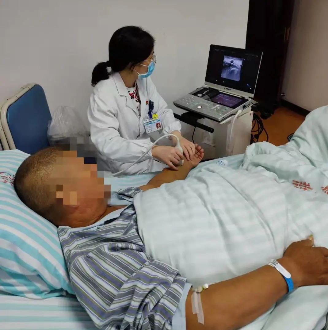 手術(shù)后第二天,秦主任在病床邊為孫師傅用彩超再次評估