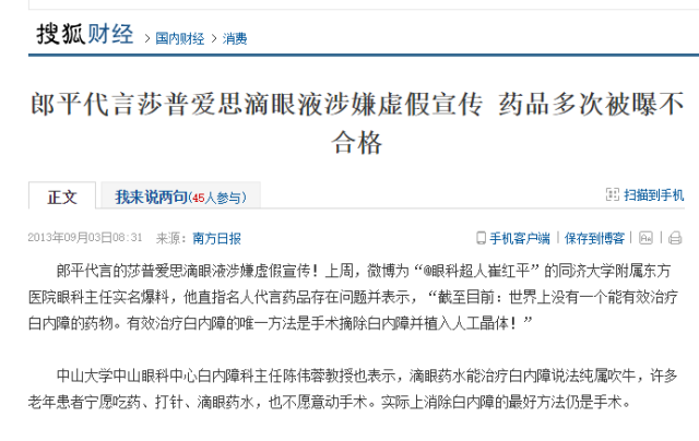 文章引用了多名眼科專家的說法和權(quán)威文獻(xiàn)資料,力證“莎普愛思滴眼液”并不能預(yù)防和治療白內(nèi)障;同時(shí)指出,這種洗腦式的廣告營銷,會延誤白內(nèi)障老人的治療,增加其失明風(fēng)險(xiǎn)。