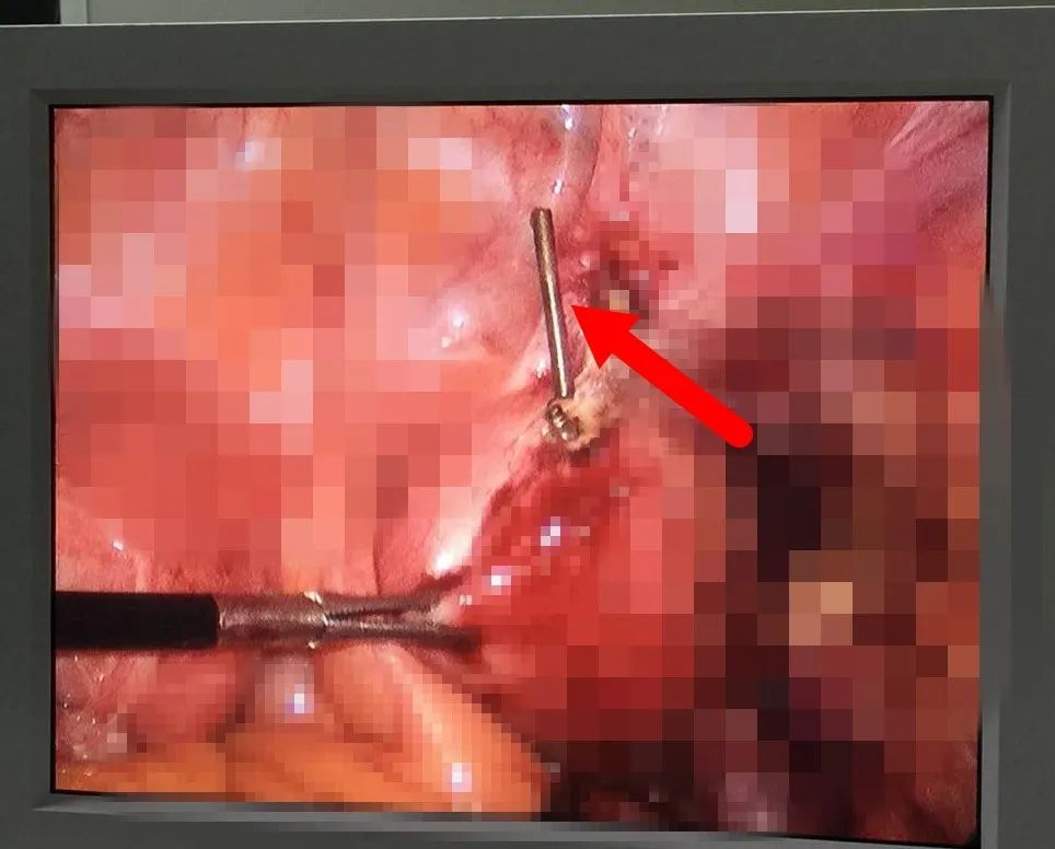 △通過腹腔鏡畫面,可看到節(jié)育環(huán)貫穿腸腔。