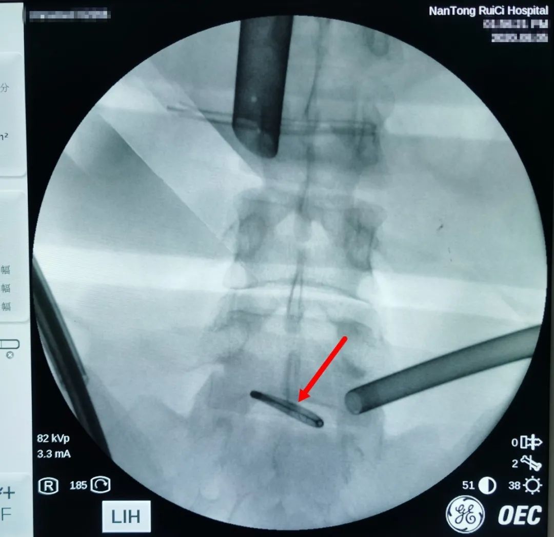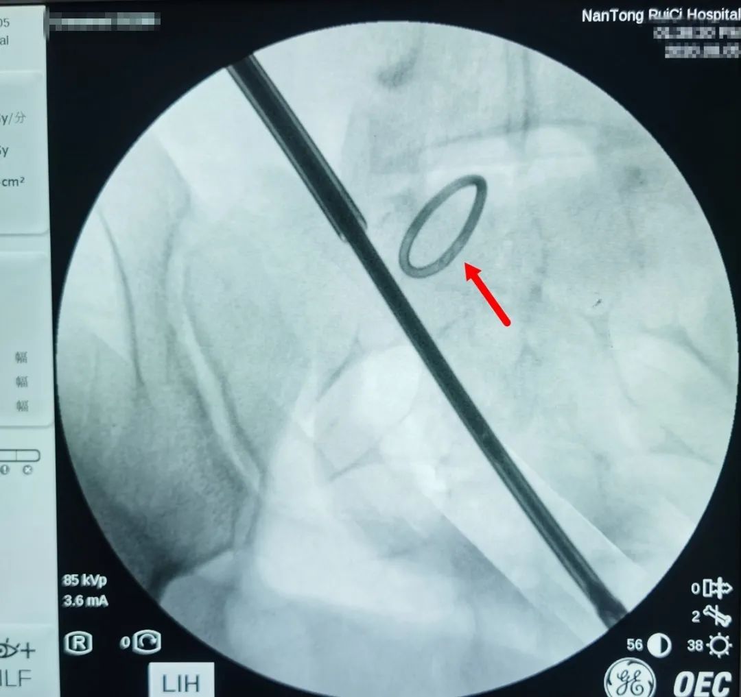 △通過術(shù)中X光,對(duì)節(jié)育環(huán)進(jìn)行標(biāo)記定位。