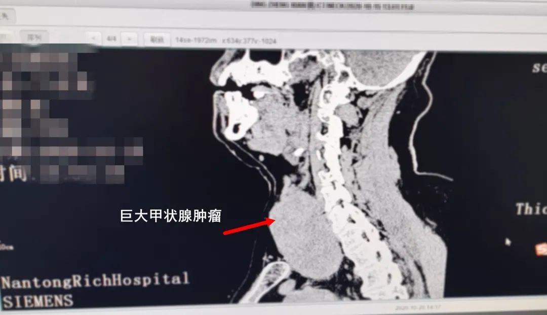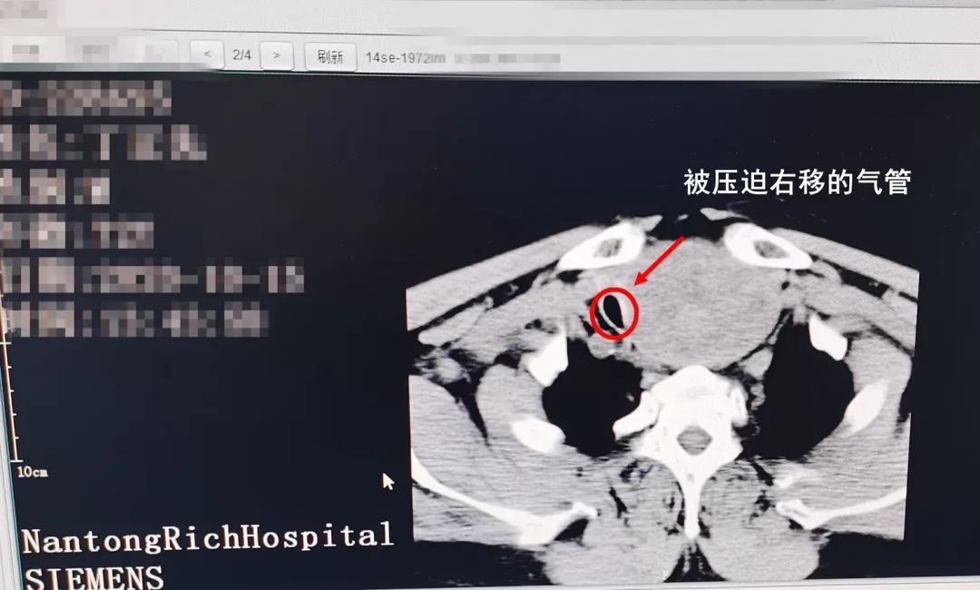 讓丁爺爺沒想到的是,他的病情遠(yuǎn)非氣管炎這么簡(jiǎn)單。在當(dāng)?shù)蒯t(yī)院檢查后,醫(yī)生發(fā)現(xiàn),丁爺爺?shù)牟弊幼筮呴L(zhǎng)了個(gè)大腫塊,正是這個(gè)巨大的腫塊將丁爺爺?shù)臍夤軘D壓變形,發(fā)生了右移,所以才會(huì)出現(xiàn)呼吸困難的癥狀。之后丁爺爺被診斷為胸骨后巨大甲狀腺腫瘤,高度懷疑惡性。