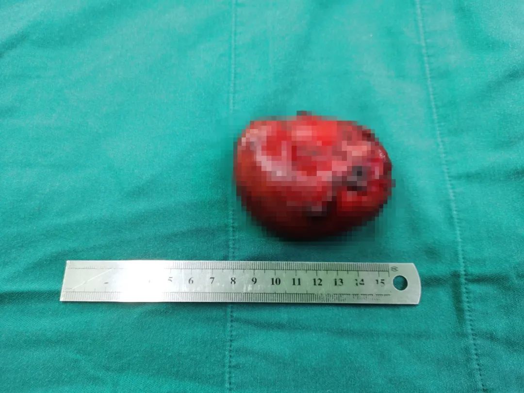 如果任由腫瘤發(fā)展,丁爺爺隨時(shí)可能有窒息風(fēng)險(xiǎn),因而對(duì)于老人的病情,醫(yī)院高度重視,第一時(shí)間聯(lián)絡(luò)上海專家會(huì)診。10月21日,在上海交大甲狀腺疾病診治中心主任樊友本教授和上海第六人民醫(yī)院普外科主任、也是上一任的上海交大甲狀腺疾病診治中心主任鄭起教授的共同指導(dǎo)下,老人成功在瑞慈醫(yī)院完成了手術(shù),完整摘除了這個(gè)直徑約8厘米,比鵝蛋還要大一圈的腫瘤。