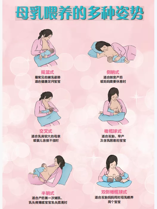 側(cè)臥式:適合剖宮產(chǎn)術(shù)后、產(chǎn)后第一天。搖籃式:母親喜歡,比較常見。