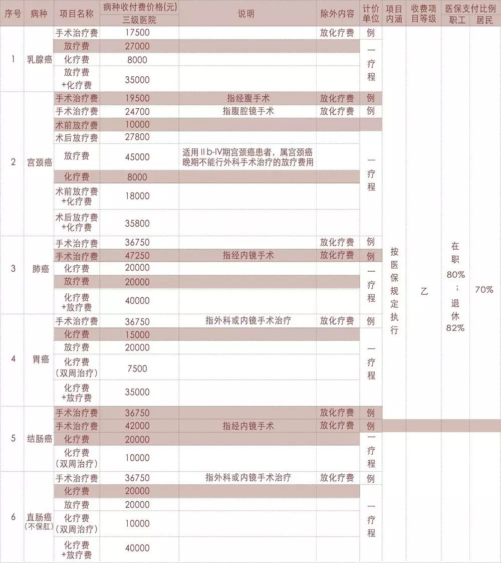 2.以上病種的手術治療、放化療及規(guī)定的病種收費標準包含患者住院期間所發(fā)生的診斷與治療等各類費用,即從患者入院,按病種治療管理流程接受規(guī)范化診療最終達到療效標準出院,整個過程中所發(fā)生的診斷、治療、手術、麻醉、護理、床位、藥品、放療(含定位、制模等費用)以及醫(yī)用材料等各種費用。