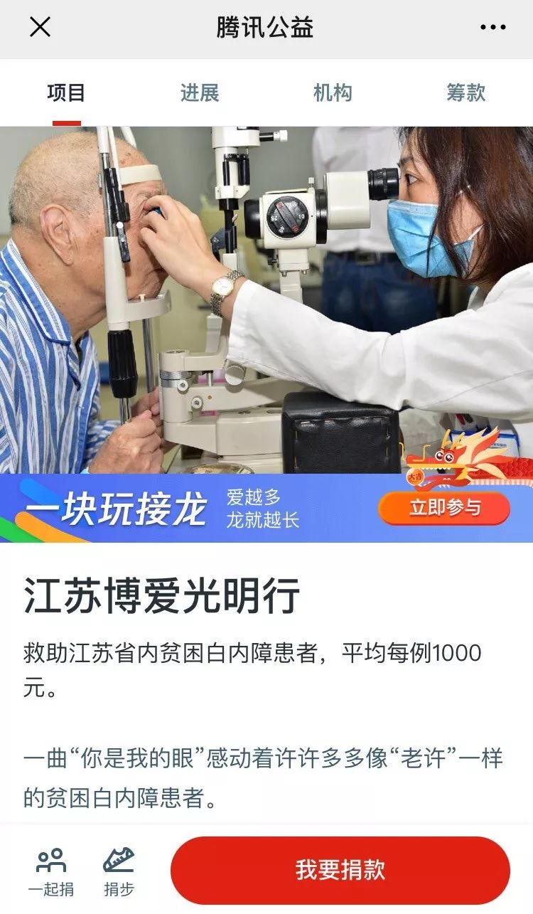 進(jìn)入騰訊公益的籌款頁面后,您會(huì)看到“博愛光明行(南通)”項(xiàng)目,如下圖所示。點(diǎn)擊“我要捐款”,就可以為貧困白內(nèi)障患者捐款,獻(xiàn)出您的愛心。