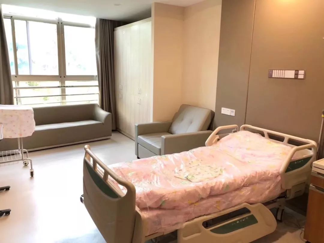 母嬰同室,每床面積近50平方米,擁有獨立衛(wèi)生間和洗浴設(shè)施。配備日本八樂夢電動病床、中央空調(diào)、掛壁空調(diào)、電視、冰箱、微波爐、電水壺、沙發(fā)、陪客床、整體衣櫥、智能電動馬桶等。