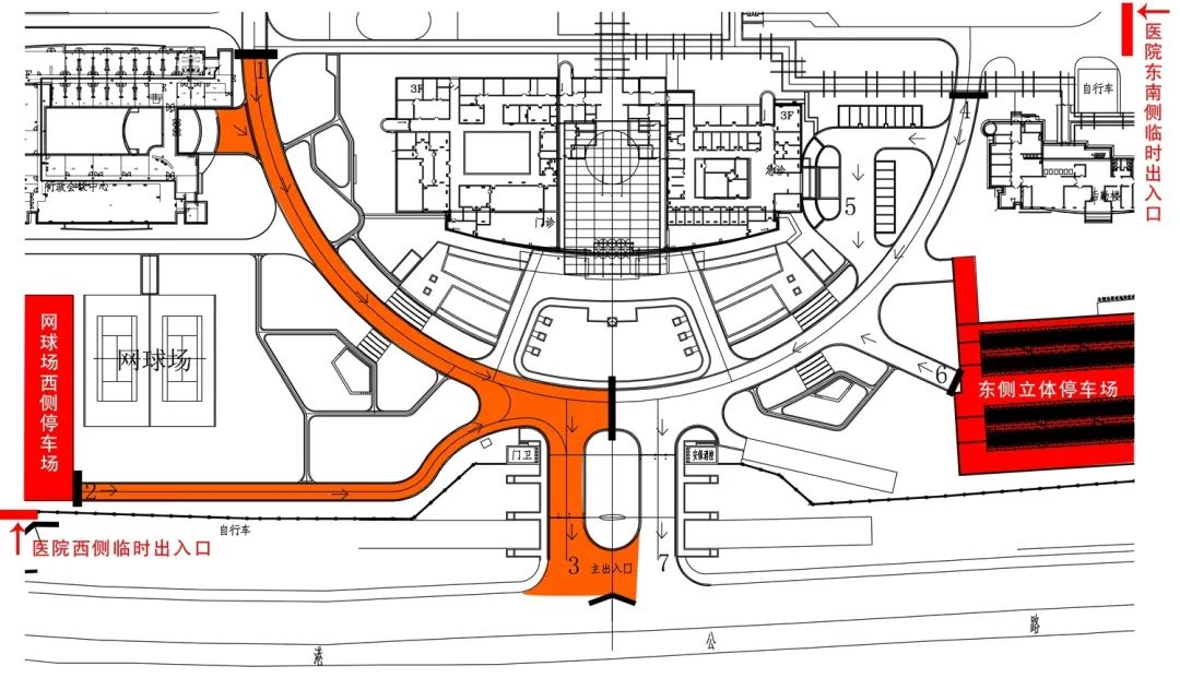 (2)醫(yī)院上班員工車輛可從醫(yī)院正大門出口(醫(yī)院正大門出口機動車3個通道當(dāng)天改為2進(jìn)1出)或施工臨時通道(醫(yī)院正大門往西150米)進(jìn)出醫(yī)院,車輛可停放至網(wǎng)球場西側(cè)停車場、網(wǎng)球場內(nèi)停車場。